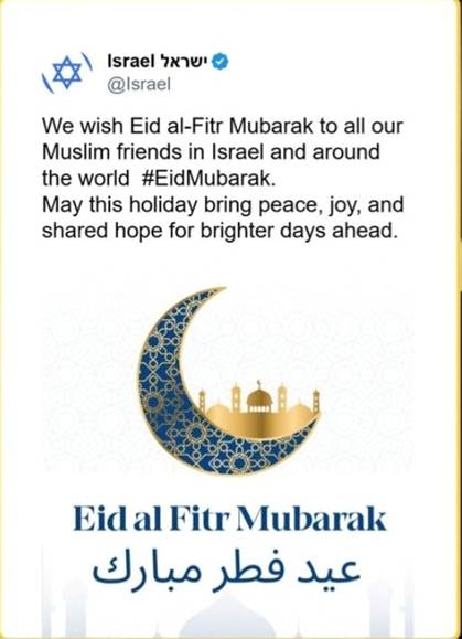 अगदी ज्यू (यहुदी) देश इस्राएलदेखील याला अपवाद नाही. बहुतेक सगळ्या मुस्लिम देशांशी धार्मिक ऐतिहासिक आणि राजकीय कट्टर वैर असलेल्या इस्त्राएलने इस्लामिक रिपब्लिक ऑफ इराण बरोबरच्या ऐन युद्धाच्या धामधुमीत देखील आपल्या मुस्लिम मित्रांना ईद-उल-फित्रच्या शुभेच्छा दिल्या आहेत.