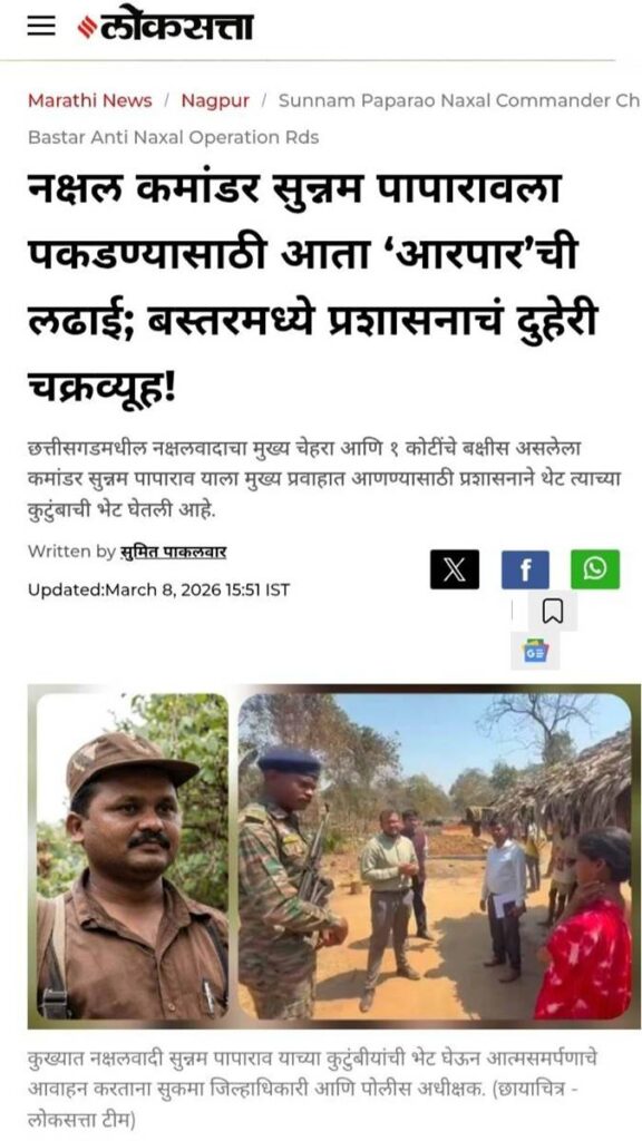 बस्तरच्या दंडकारण्यात गेली अनेक दशके दहशतीचे दुसरे नाव बनलेला आणि १ कोटींहून अधिक बक्षीस असलेला कुख्यात नक्षलवादी कमांडर सुन्नम पापाराव याच्या मुसक्या आवळण्यासाठी आता प्रशासनाने ‘आरपार’ची लढाई सुरू केली आहे. मधल्या काळात पापाराव चकमकीत मारला गेल्याच्या चर्चा होत्या. मात्र, तो आजही सशस्त्र नक्षलवाद्यांच्या तुकडीसह जंगलात सक्रिय असल्याचे स्पष्ट झाले आहे. या पार्श्वभूमीवर प्रशासनाने आता पापारावच्या आत्मसर्पणासाठी भावनिक आवाहन आणि लष्करी दबाव असे दुहेरी चक्रव्यूह रचले आहे.