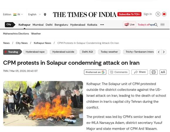 गुरुवार, ५ मार्च २०२६ रोजी एक बातमी आली आहे. सोलापूरच्या मार्क्सवादी कम्युनिस्ट पक्षाच्या (CPI-M) वतीने माजी आमदार नरसैय्या आडम मास्तरांच्या नेतृत्वाखाली पक्षाच्या कार्यकर्त्यांनी काळे कपडे घालून, घोषणाबाजी करत अमेरिकेचे राष्ट्राध्यक्ष डोनाल्ड ट्रम्प आणि इस्त्रायलचे पंतप्रधान बेंजामिन नेत्यानाहू यांचे प्रतिकात्मक पुतळ्याचे दहन केले. आणि अमेरिका- इस्त्रालयच्या इराणवरील हल्ल्याचा निषेध करून इराणला पक्षाचे समर्थन असल्याचे सांगितले.