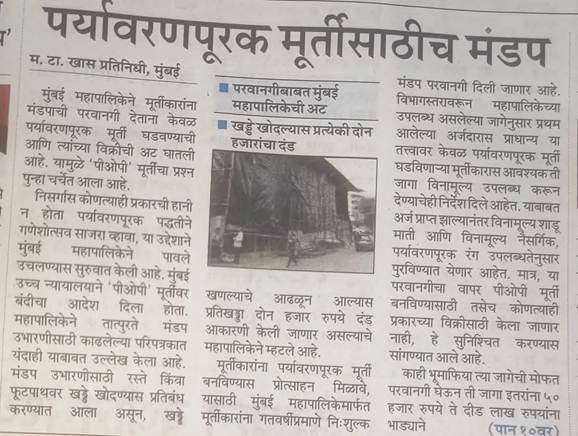 शनिवार, २८ मार्च २०२६च्या महाराष्ट्र टाईम्समध्ये पहिल्या पानावर “पर्यावरणपूरक मूर्तींसाठीच मंडप” अशी एक उत्साहवर्धक बातमी दिली आहे. बातमीचा मतितार्थ असा आहे की, “येत्या गणेशोत्सवासाठी मुंबई महापालिकेने मूर्तीकारांना तात्पुरत्या मंडपाची परवानगी देताना केवळ पर्यावरण पूरक मूर्ती घडवण्याची आणि त्यांच्या विक्रीची अट घातली आहे. केवळ पर्यावरणपूरक मूर्ती घडवणाऱ्या मूर्तीकारास आवश्यक ती जागा विनामूल्य उपलब्ध करून दिली जाणार असून, विनामूल्य शाडू माती आणि विनामूल्य नैसर्गिक, पर्यावरणपूरक रंग उपलब्धतेनुसार पुरवण्यात येणार आहेत. मात्र त्यासाठी मूर्तीकारांना हमीपत्र द्यावे लागणार आहे.”