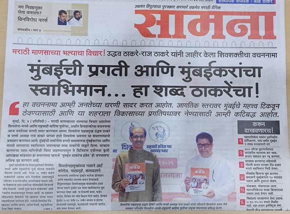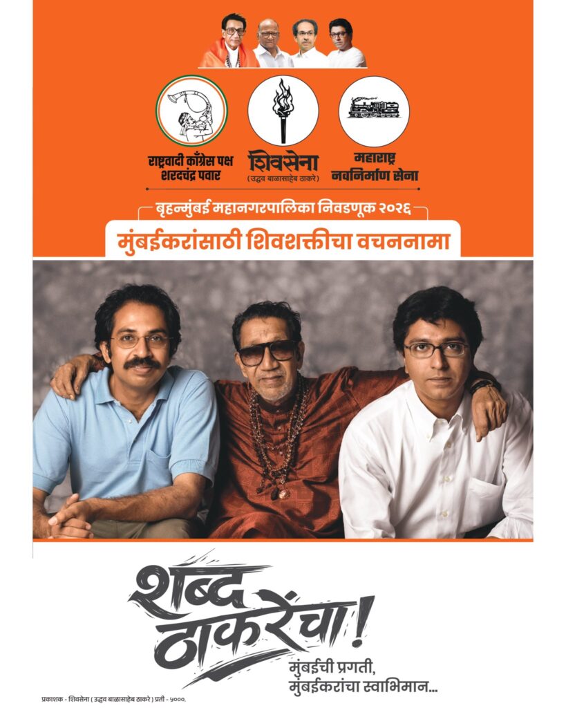 ४ जानेवारी २०२६ रोजी दादरच्या सेना भवनात उबाठा, मनसे आणि राष्ट्रवादी काँग्रेस (शप) यांच्या युतीचा मुंबई महानगरपालिकेच्या निवडणुकीचा संयुक्त वचननामा उद्धव ठाकरे आणि राज ठाकरे यांनी जाहीर केला.