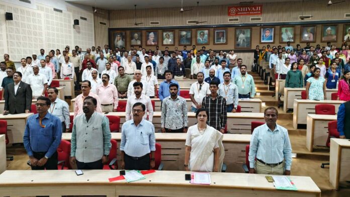 कोल्हापूर – शिवाजी विद्यापीठात ‘वंदे मातरम्’ या राष्ट्रीय गीताच्या १५० व्या सार्धशताब्दीनिमित्त या गीताचे सामूहिक गायन आज उत्साहपूर्ण वातावरणात करण्यात आले. प्रभारी कुलगुरू डॉ. सुरेश गोसावी आणि प्रभारी प्र-कुलगुरू डॉ. ज्योती जाधव यांच्या मार्गदर्शनाखाली विद्यार्थी विकास विभागाने या कार्यक्रमाचे संयोजन केले.